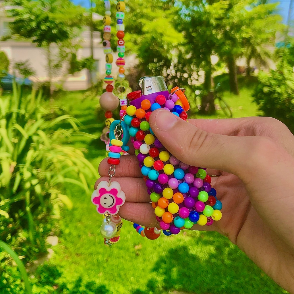Porta-isqueiro colorido com alça feita com mix de entremeios diversos e coloridos.